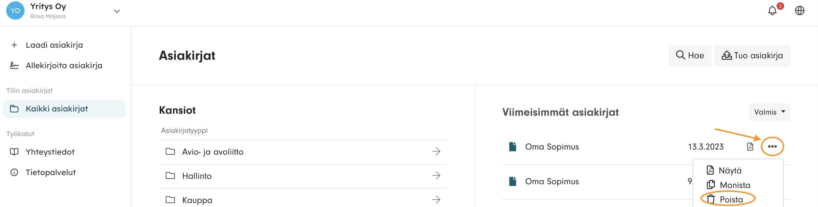 Kaikki asiakirjat -osiossa (arkisto) olevan asiakirjan voit poistaa klikkaamalla asiakirjan kohdalta kolmea pistettä ja sen jälkeen valitsemalla "Poista".