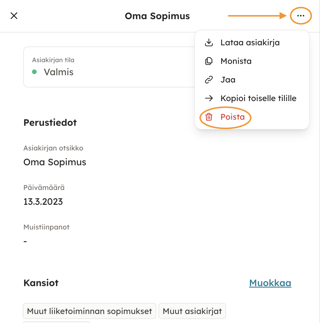 Poista-toiminto löytyy lisäksi asiakirjan arkistokortilta, klikkaamalla kolmea pistettä voit valita toiminnon "Poista".