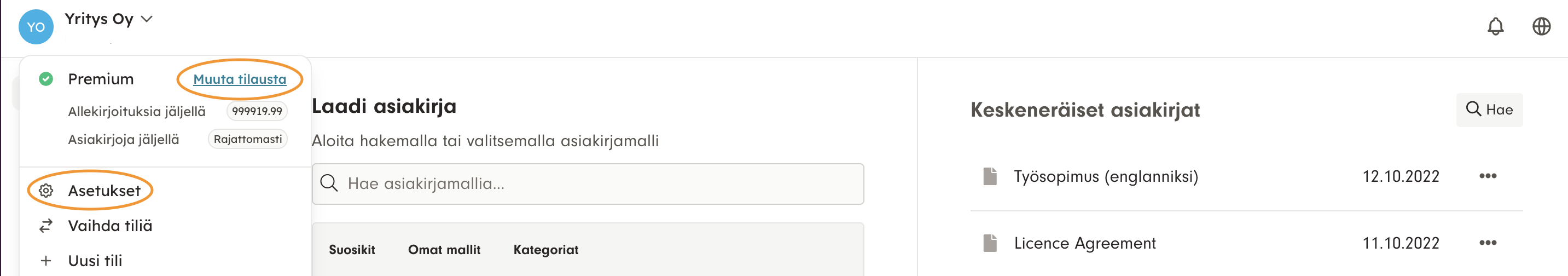 2. Jos haluat päivittää nykyinen tilauksesi klikkaa yrityksen nimeä vasemmasta yläkulmasta ➡️ "Muuta tilausta". Voit myös päivittää tilauksen asetusten kautta.