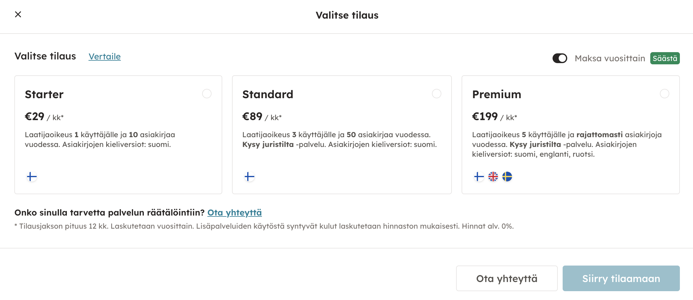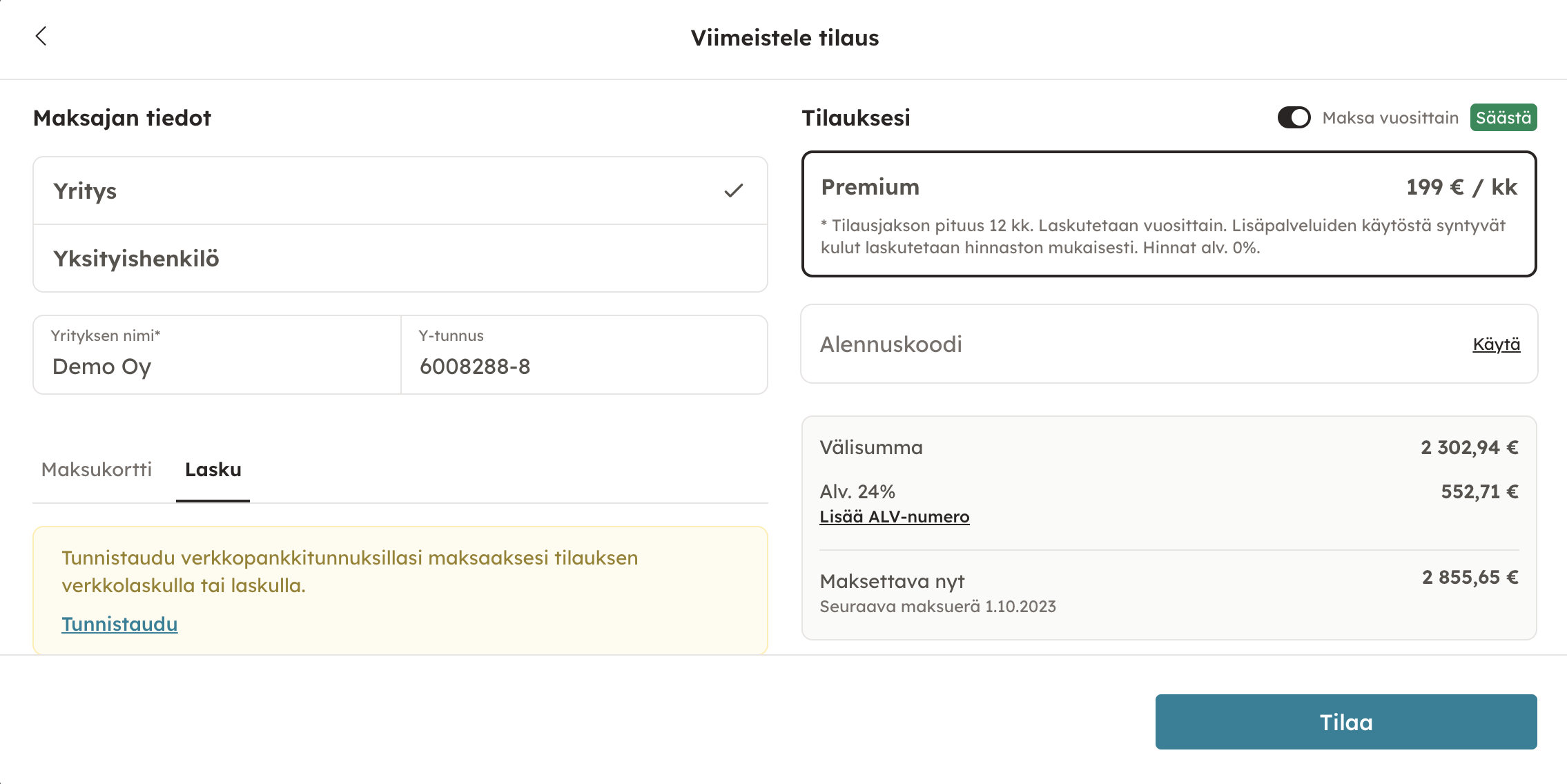 5. Valittuasi tuotepaketin sinut ohjataan vielä täyttämään laskutustiedot. Kun tilaus on vahvistettu "Tilaa"-painikkeella, on palvelu heti käytettävissäsi. Onnittelut erinomaisesta päätöksestä! 😊