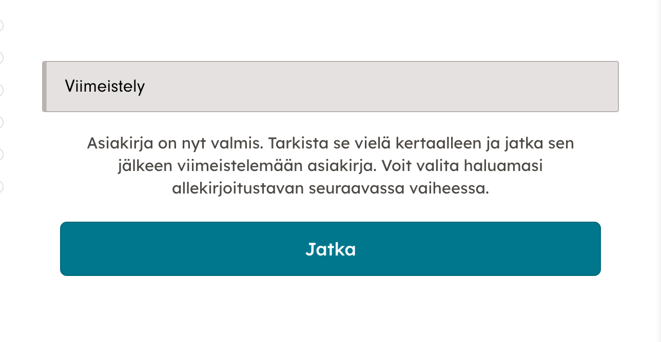 1. Kun palvelussa laatimasi asiakirja on valmis, lue se vielä läpi varmistaaksesi, että tiedot ovat oikein ja valitse lopuksi "Jatka". Tässä vaiheessa palvelu huomauttaa, mikäli jokin pakollinen tieto vielä puuttuu ja näyttää puutteellisen kohdan asiakirjan laatimisnäkymässä punaisella värillä merkittynä, jotta löydät sen helposti ja pääset tekemään korjaukset.