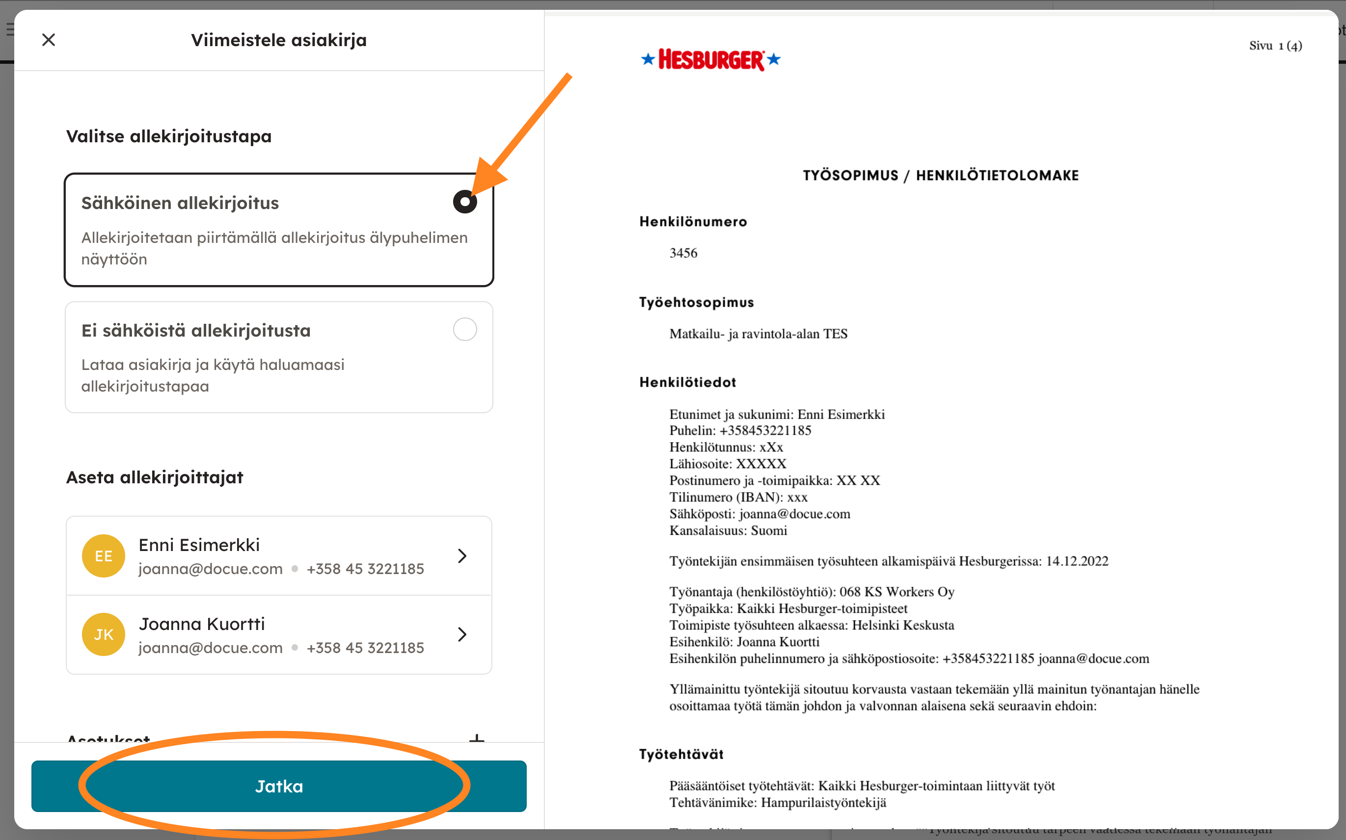 Vahvista allekirjoitustavan valinta "Jatka"-painikkeella.