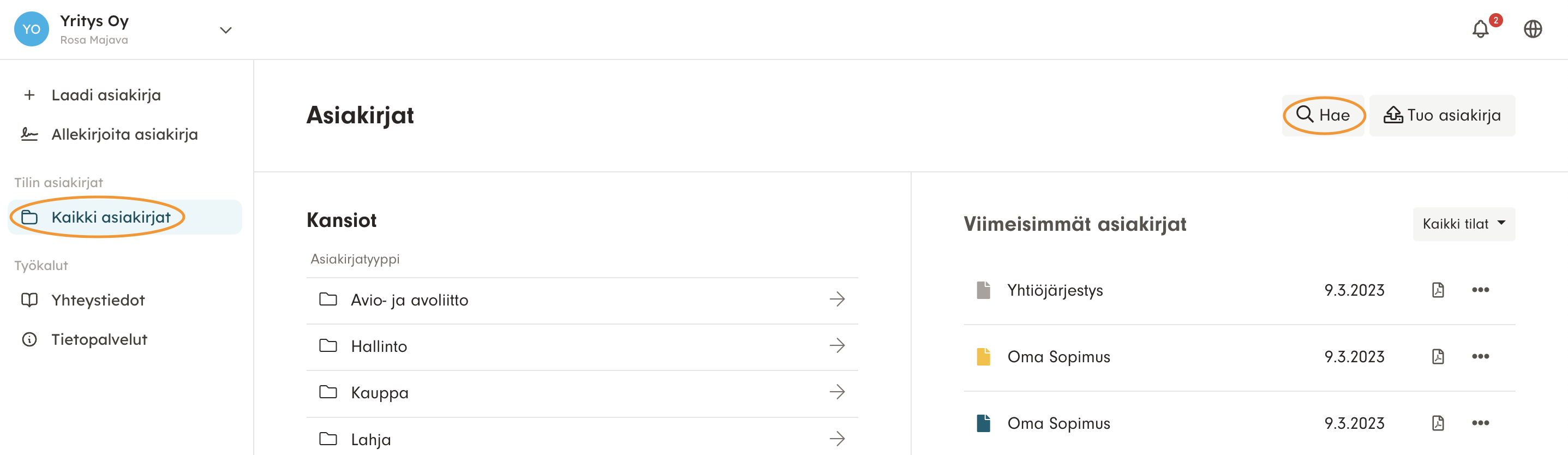 Asiakirjakortin saat avattua klikkaamalla haluamaasi asiakirjaa palvelun "Kaikki asiakirjat"-osiossa. Asiakirjakortin voit klikata auki niin "Kaikki asiakirjat"-osion listausnäkymästä, kansion sisältä kuin hakutoiminnon tulostenkin kautta.