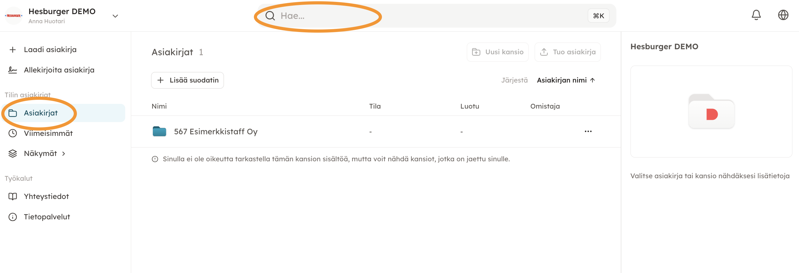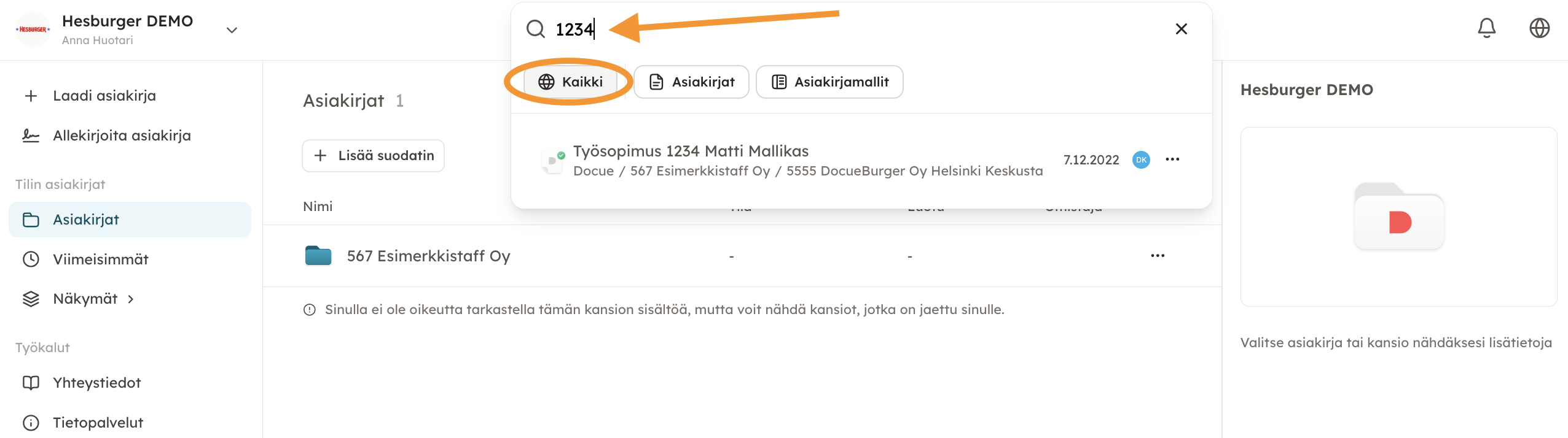 Kun oikea asiakirja on löytynyt, avaa sen asiakirjakortti klikkaamalla asiakirjan nimeä.