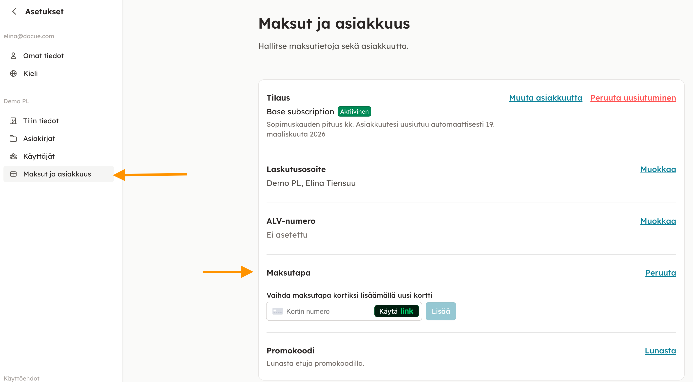 Jos tarvitset lisätietoja maksutavasta tai sen muutoksesta, ole yhteydessä asiakastukeemme support@docue.com.