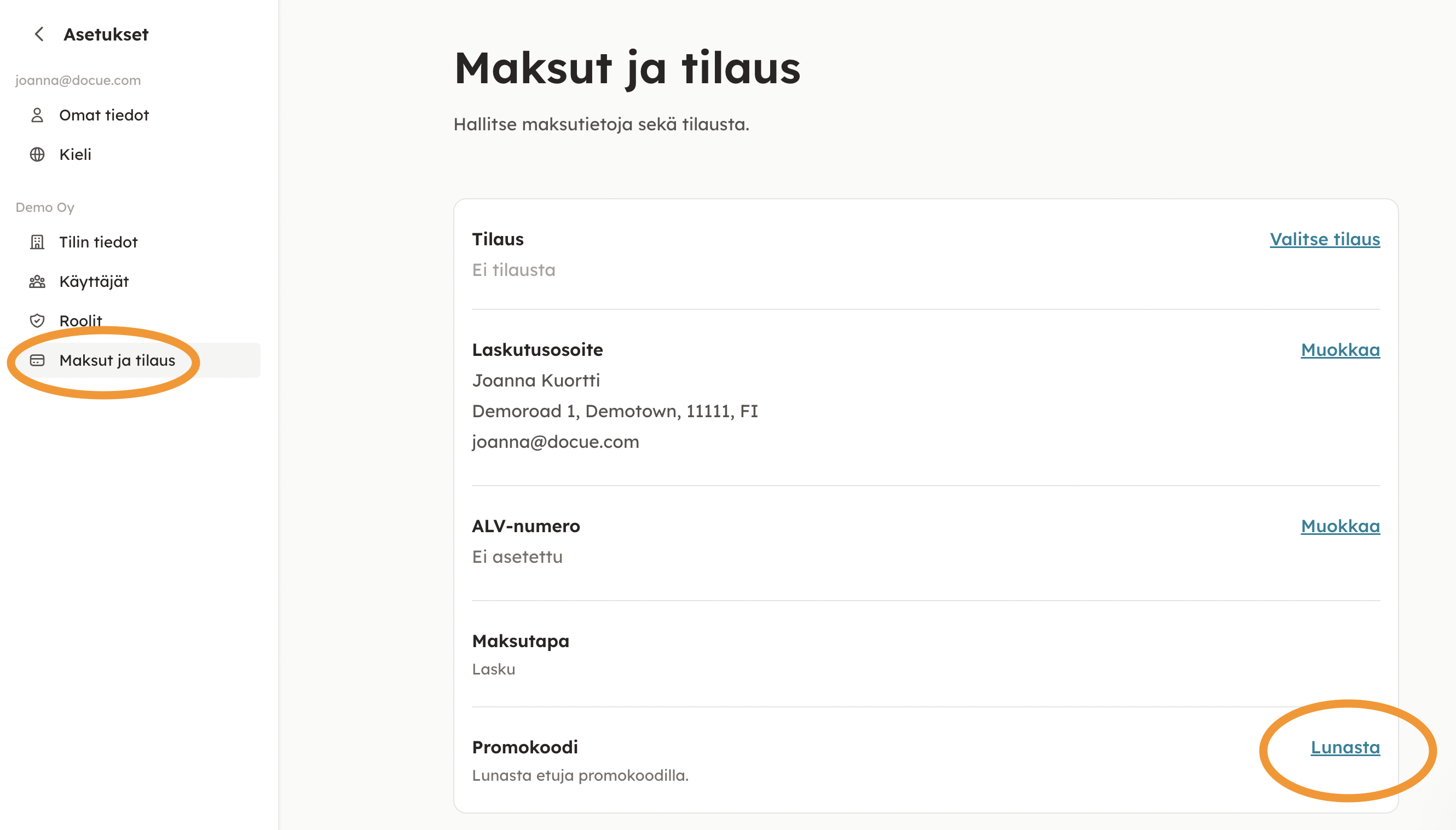 Lahjakortin lunastaminen tapahtuu oman tilisi asetusten kautta syöttämällä lahjakortin koodin alla olevan esimerkkikuvan mukaisesta kohdasta.