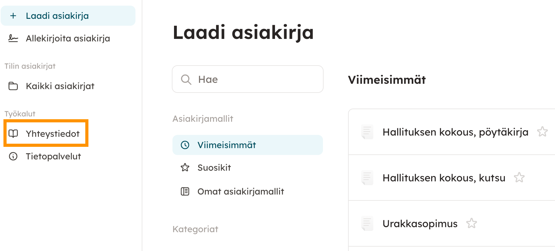 Avautuvasta näkymästä pääset hallinnoimaan ja lisäämään yhteystietoja. Voit tallentaa yhteystiedoiksi sekä henkilöitä että yrityksiä. Hae-toiminnon avulla voit hakea tiettyä yhteystietoa tallentamiesi henkilöiden ja yritysten joukosta.