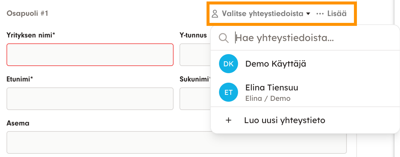 Kun tallennat henkilön tai yrityksen yhteystiedoksi, pääset asiakirjojen laatimisvaiheessa täydentämään osapuolen yhteystiedot lomakkeelle automaattisesti. Voit valita osapuolen omien yhteystietojesi listasta, joten sinun ei tarvitse tässä vaiheessa käyttää aikaa yhteystietojen etsimiseen ja täydentämiseen.