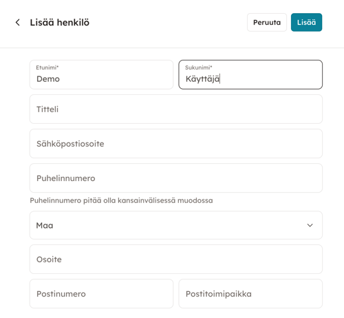 Lisää henkilö tai yritys täyttämällä vaaditut tiedot ja klikkaa sen jälkeen oikean ylänurkan "lisää"-nappia.