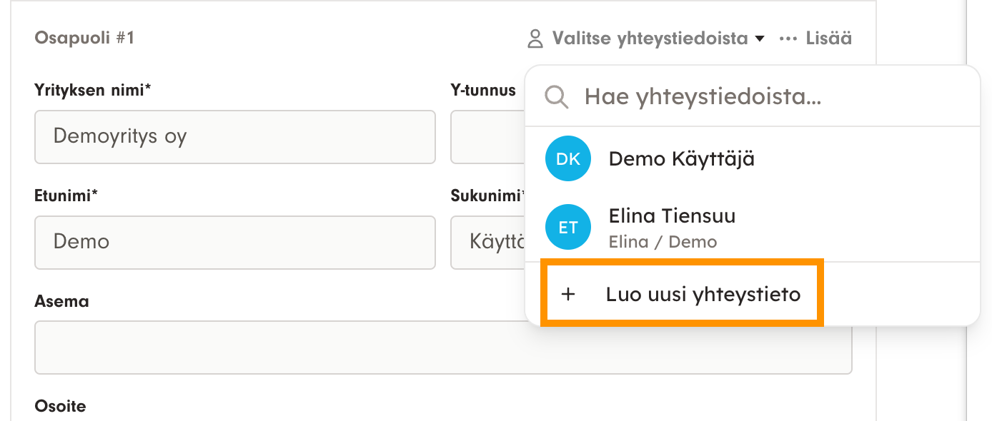 Yhteystietoja voi lisätä myös asiakirjojen laatimisen tai allekirjoituttamisen yhteydessä. Kun pääset näkymään, jossa tallennetaan osapuolten yhteystietoja, klikkaa oikeasta ylänurkasta "valitse yhteystiedoista" ja klikkaa "luo uusi yhteystieto". Uuden yhteystiedon luonnin jälkeen sinun on joka kerta helppo valita yhteystietoluettelosta haluamasi henkilö tai yritys.