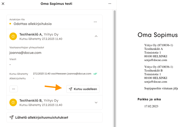 Mikäli olet jo ehtinyt lähettää asiakirjan allekirjoitettavaksi, mutta sinun tarvitsee muokata allekirjoituskutsun yhteystietoja esimerkiksi kirjoitusvirheen vuoksi, onnistuu tämä avaamalla lähetetty asiakirja ja valitsemalla muokattavan osapuolen kohdalta " kutsu uudelleen".