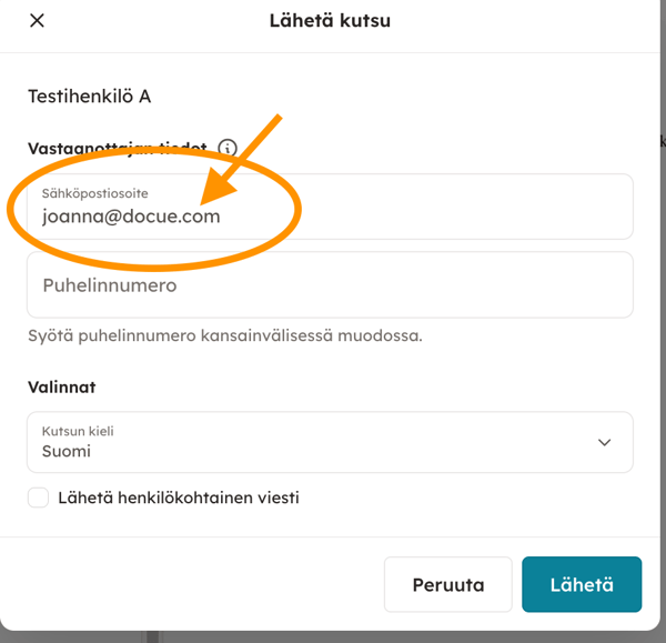 Kun olet painanut "kutsu uudelleen" nappia, saat näkyville valikon, jossa pääset muokkaamaan osapuolen sähköpostia ja/tai puhelinnumeroa. Tämän jälkeen voit lähettää asiakirjan allekirjoitettavaksi.