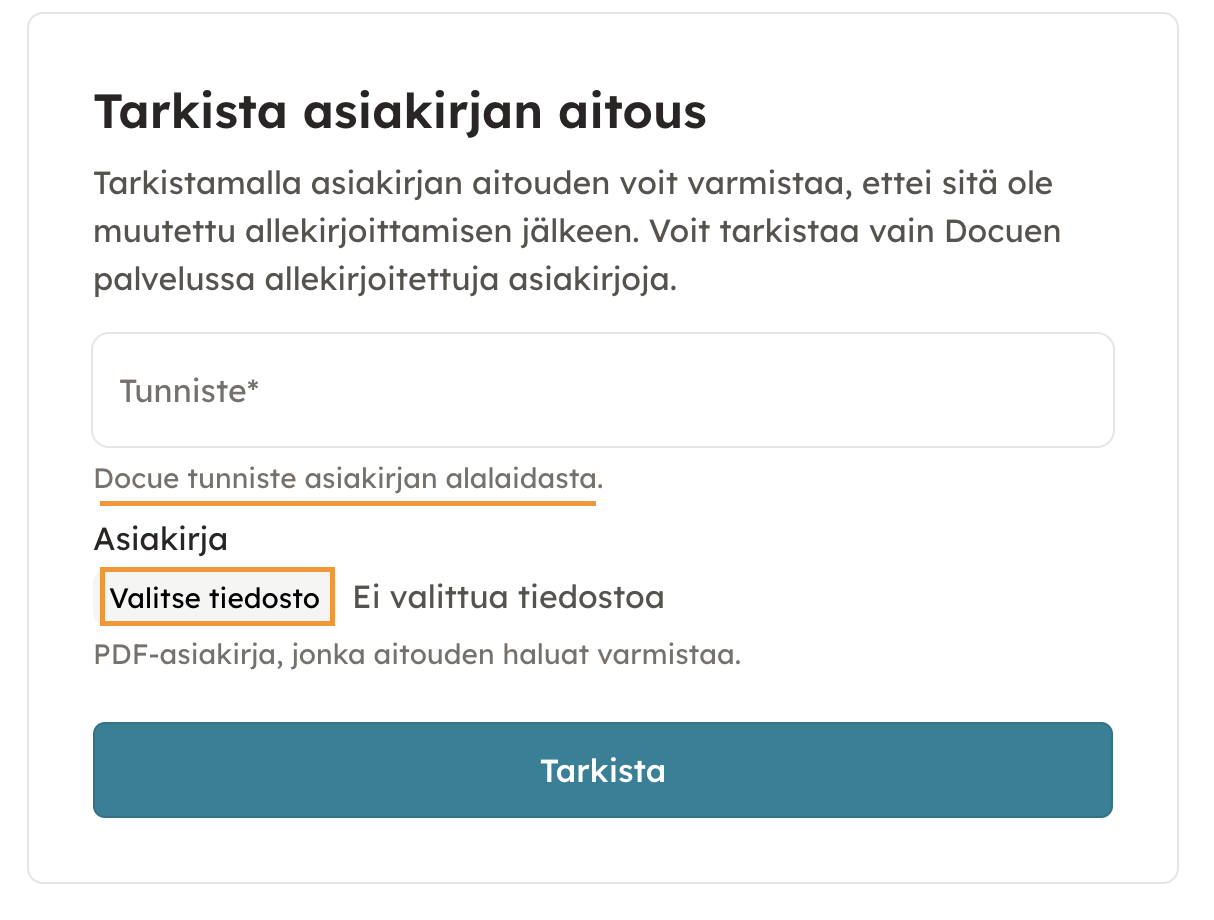 Asiakirjan muuttumattomuuden voi tarkistaa Docuen palvelun kautta osoitteessa https://app.docue.com/verify. Täytä Docuen kautta allekirjoitetun asiakirjan alalaidasta löytyvä tunniste ja lataa tarkistettava asiakirja PDF-muodossa.