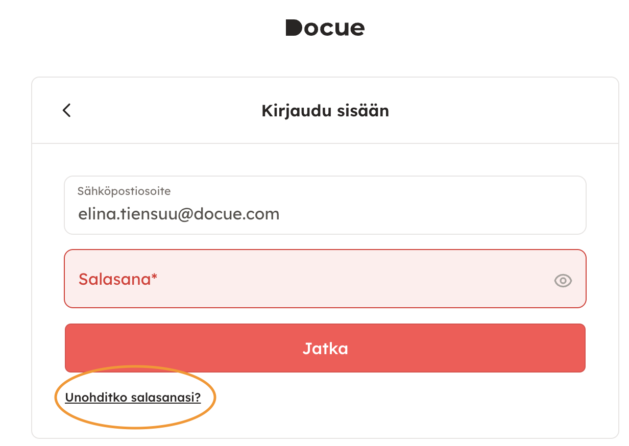 Saat sähköpostiosoitteeseesi salasanan palautuslinkin. Jos et saa palautuslinkkiä, palvelustamme ei löydy käyttäjää antamallasi sähköpostiosoitteella. Jos olet unohtanut rekisteröimäsi sähköpostiosoitteen, olethan yhteydessä Docuen asiakaspalveluun.
