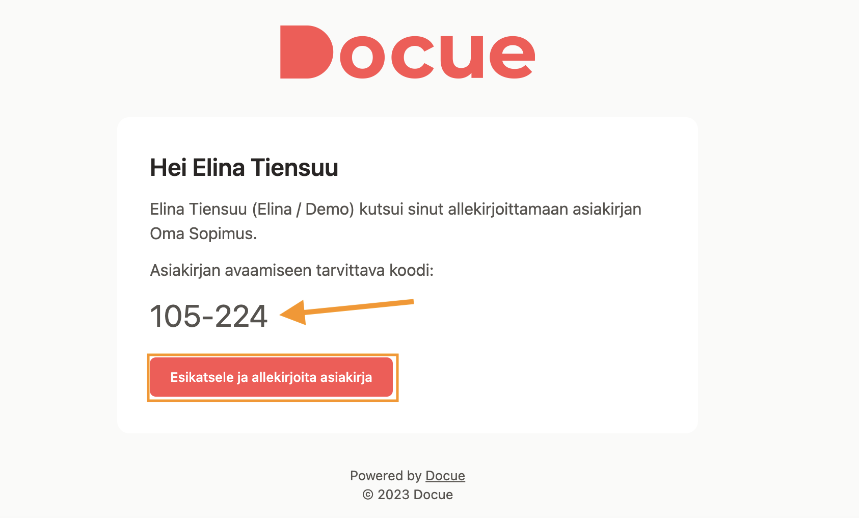 Esimerkki sähköpostiin tulleesta allekirjoituskutsusta. Kopioi nuolen osoittama koodi. Tarvitset sitä asiakirjan avaamiseksi. Avaa allekirjoituskutsu klikkaamalla "Esikatsele ja allekirjoita asiakirja" -kohtaa.
