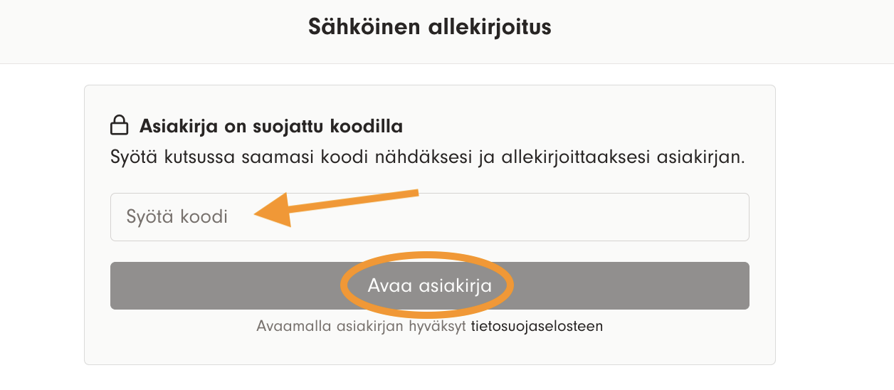 Kun koodi on syötetty oikein, "Avaa asiakirja"-näppäin muuttuu mustaksi ja pääset avaamaan allekirjoitettavan asiakirjan.