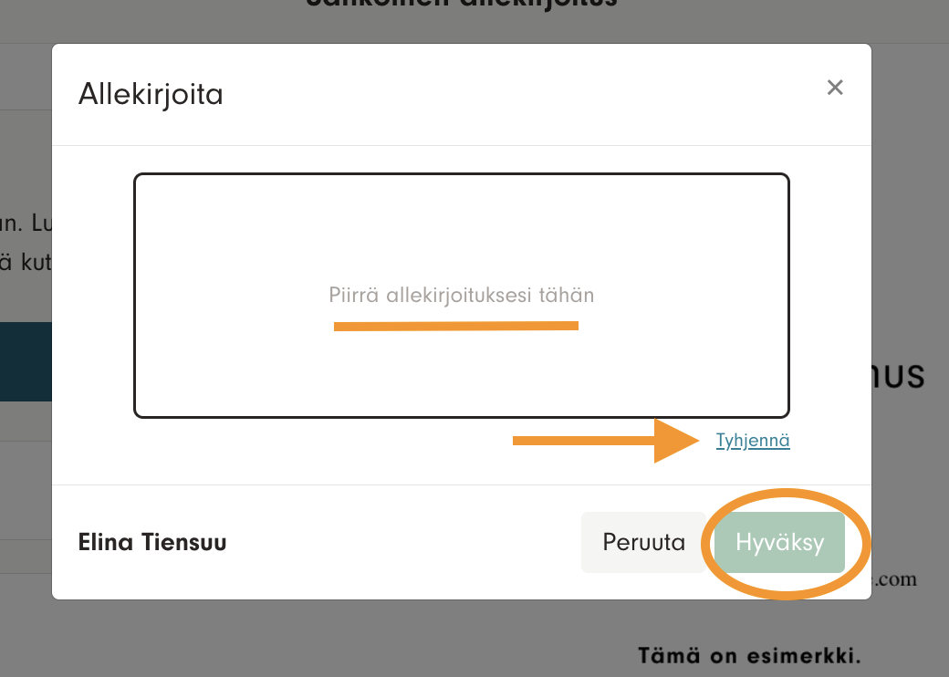 Piirrä allekirjoituksesi laitteesta riippuen joko hiirellä tai sormella. Jos haluat aloittaa alusta, klikkaa "tyhjennä". Kun olet tyytyväinen allekirjoitukseesi, paina "Hyväksy".