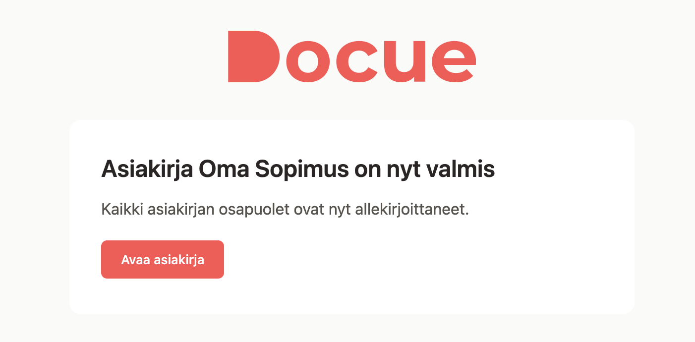 Kun kaikki osapuolet ovat allekirjoittaneet asiakirjan, pääset lataamaan asiakirjan ja lähettämään sen sähköpostiisi. Huomaathan, että allekirjoittamiskutsussa oleva linkki ja koodi ovat voimassa vain 14 vuorokautta tietoturvasyistä johtuen.