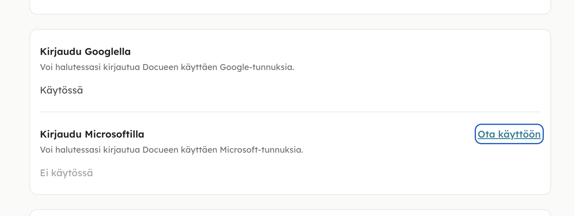 Docuen järjestelmään on mahdollista kirjautua sähköpostiosoitteen lisäksi sekä Microsoft- että Google-tunnuksilla, jotka työpaikka jakaa työntekijöille. Microsoft- tai Google-kirjautuminen voi vaatia sen, että oman yrityksen IT-osasto lisää Docuen sallittujen palveluiden listalle.