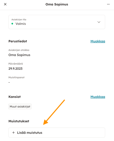 Muistutus-toiminnon saa asetettua asiakirjan asiakirjakortin kautta. Klikkaa asiakirjan nimeä tai asiakirjakortti-kuvaketta ja valitse + Lisää muistutus.