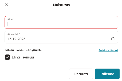 Kirjaa muistutuksen aihe, ajankohta ja valitse, keille kaikille tilin käyttäjille muistutus lähtee valittuna ajankohtana. Tallentamisen jälkeen valitut käyttäjät saavat muistutuksen haluttuna ajankohtana sähköpostiinsa.