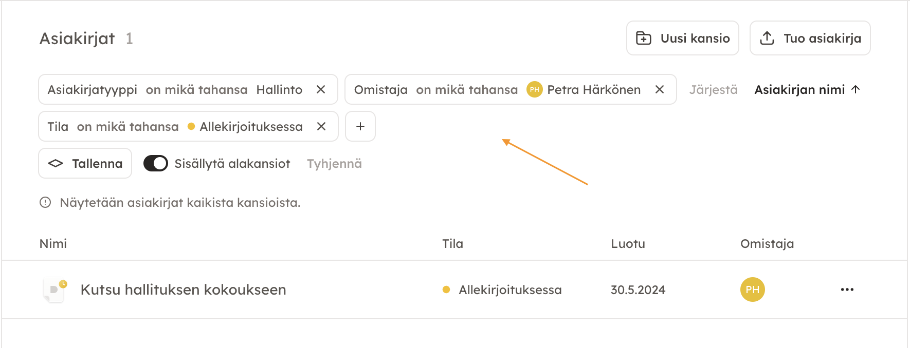 Kun haet asiakirjoja suodattimien avulla, kannattaa miettiä haluatko valita "Sisällytä alakansiot" valintaa. Mikäli et valitse sitä, hakee järjestelmä vain asiakirjat, jotka ovat kyseisessä kansiossa. Eli esimerkiksi jos olet pääkansiossa, hakee palvelu vain asiakirjat sieltä, eikä erillisistä kansioista. Tämä voi olla hyvä vaihtoehto, jos sinun tulee esimerkiksi siirtää pääkansiosta tietyt asiakirjat tiettyyn alakansioon.