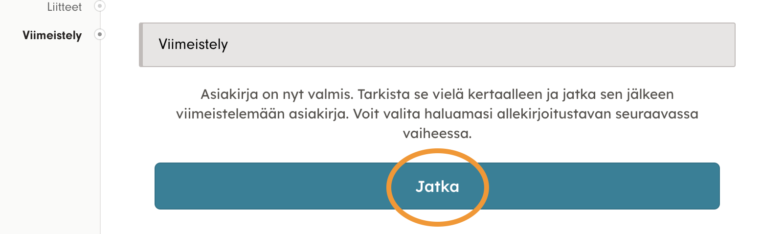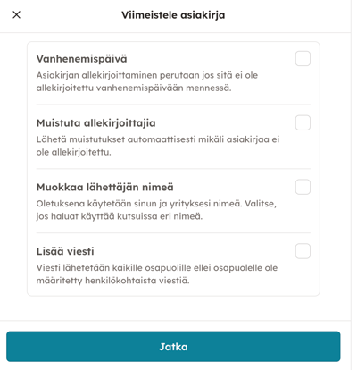 Klikkaamalla Jatka vahvistat viimeistelyn ja pääset valitsemaan, lähtevätkö allekirjoituskutsut automaattisesti vai lähetätkö ne itse seuraavassa vaiheessa.
