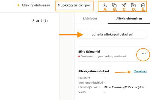 Allekirjoittaminen ja allekirjoitusasetuksetSeuraavaksi pääset vielä tarkistamaan asiakirjasi sisällön kokonaisuudessaan. Mikäli sinun täytyy tehdä muutoksia, pääset palaamaan takaisin Muokkaa asiakirjaa -kohdan kautta. Asiakirjan palauttaminen muokkaustilaan mitätöi asiakirjan allekirjoitukset sekä lähetetyt allekirjoituskutsut, siksi suositamme, että asiakirja tarkastetaan huolella ennen viimeistelyä.