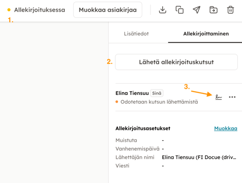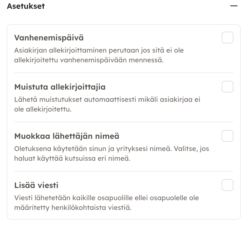 Kun olet laatinut asiakirjan valmiiksi ja valinnut allekirjoitustavan, pääset halutessasi asettamaan allekirjoitusasetuksia, joita ovat