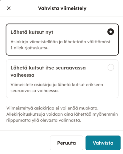 Allekirjoitustavan valinnan ja asetusten määrittämisen jälkeen pääset viimeistelemään asiakirjan valitsemalla lähetätkö kutsut heti vai manuaalisesti seuraavassa vaiheessa. Vaikka valitsisit kutsujen lähettämisen automaattisesti, pystyt tarvittaessa lähettämään allekirjoituskutsut uudestaan myös myöhemmin.