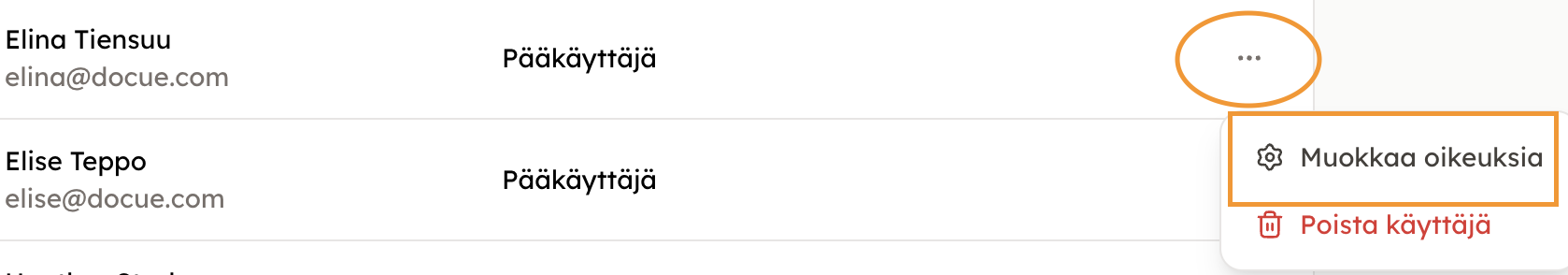 Oikeudet voi määrittää joko silloin, kun kutsuu käyttäjän tilille tai myöhemmin asetusten kohdasta käyttäjät. Aloita oikeuksien määrittäminen joko Kutsu käyttäjä -kohdasta tai valitsemalla tilillä olevan käyttäjän nimen vierestä kolme pistettä ja muokkaa oikeuksia.