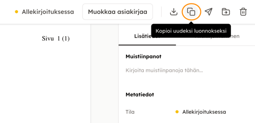 Klikkaamalla kopioi, pääset muokkaamaan kopioidun asiakirjan tietoja ja lähettämään asiakirjan allekirjoitettavaksi.