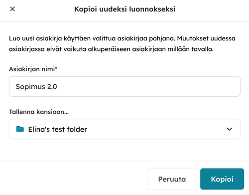Pääset luomaan uuden asiakirjan vanhan asiakirjan pohjalta. Täytä asiakirjan nimi ja valitse, mihin kansioon haluat tallentaa sen.