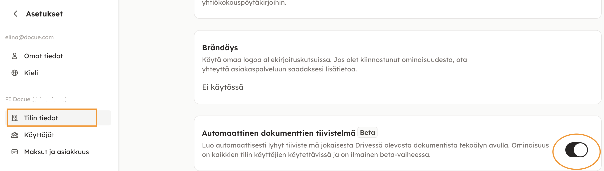 Aloita aktivoimalla Automaattinen dokumenttien tiivistelmä tilin Asetuksissa.