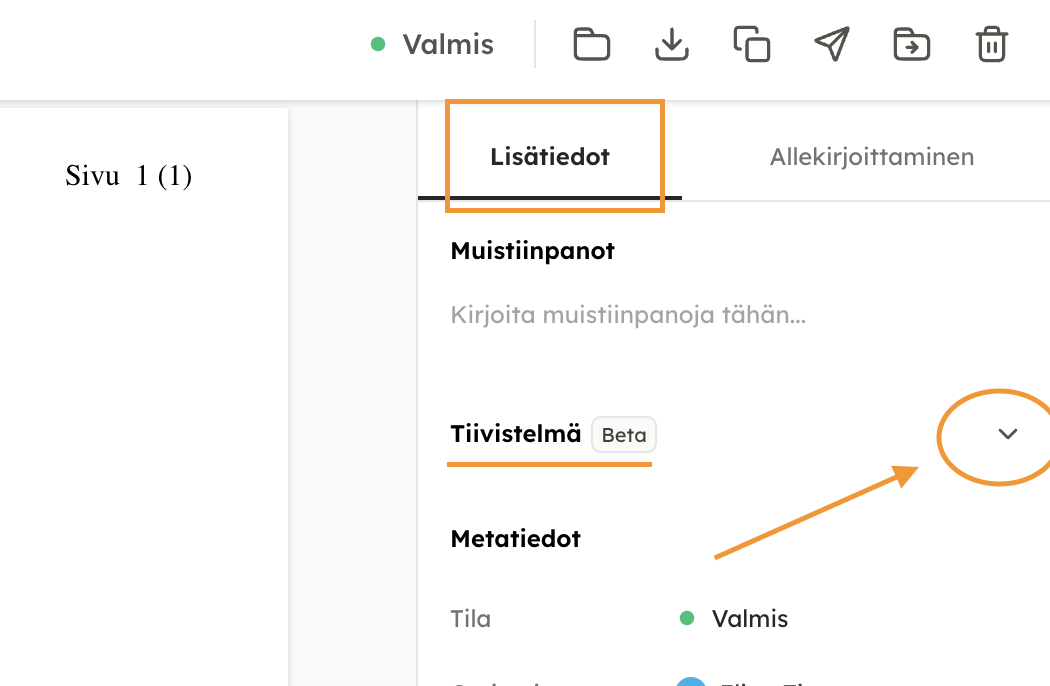 Kun haluat luoda tiivistelmän valmiista asiakirjasta, avaa haluamasi asiakirja, valitse Lisätiedot ja Tiivistelmä-kohdasta alaspäin oleva nuoli. Tekoälyn luoman tiivistelmän valmistuminen kestää hetken aikaa.