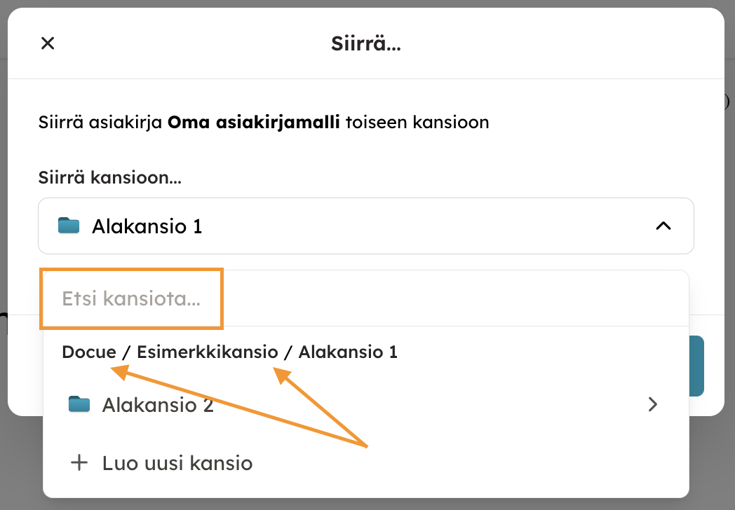 Asiasanat: kansio, siirrä kansioon, asiakirjan tallentaminen, arkisto, kansiorakenne, kansiopuu, asiakirjat