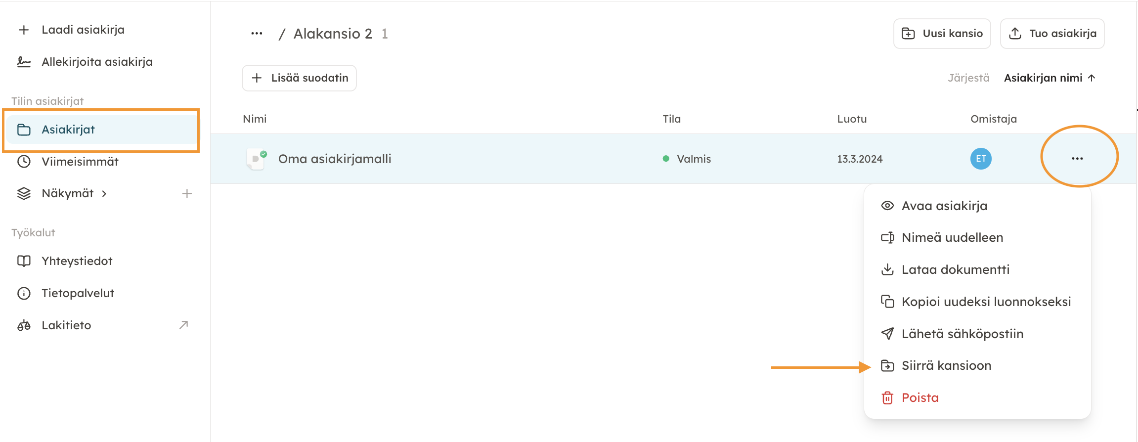 Valitse asiakirjat, mene kansioon, jossa haluamasi asiakirja sijaitsee ja valitse kolmen pisteen takaa avautuvasta valikosta siirrä kansioon.