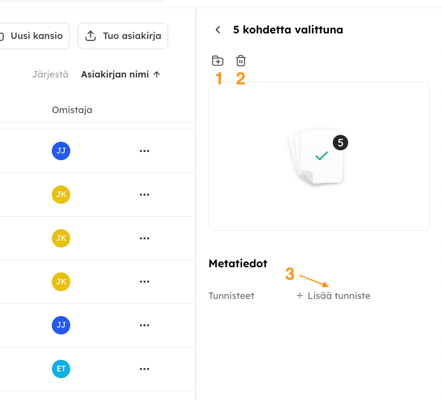 Tämän jälkeen voit joko 1) siirtää asiakirjat kansioon, 2) poistaa ne tai 3) lisätä kaikkiin asiakirjoihin saman tunnisteen.